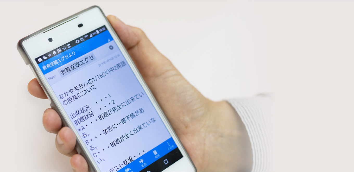 授業があったその日のうちに、学習内容や宿題状況、小テスト結果、お知らせや緊急連絡などを登録先のアドレスにメールでお送りするシステムです。お子様の状況をリアルタイムで可視化できるとたいへん好評をいただいております。